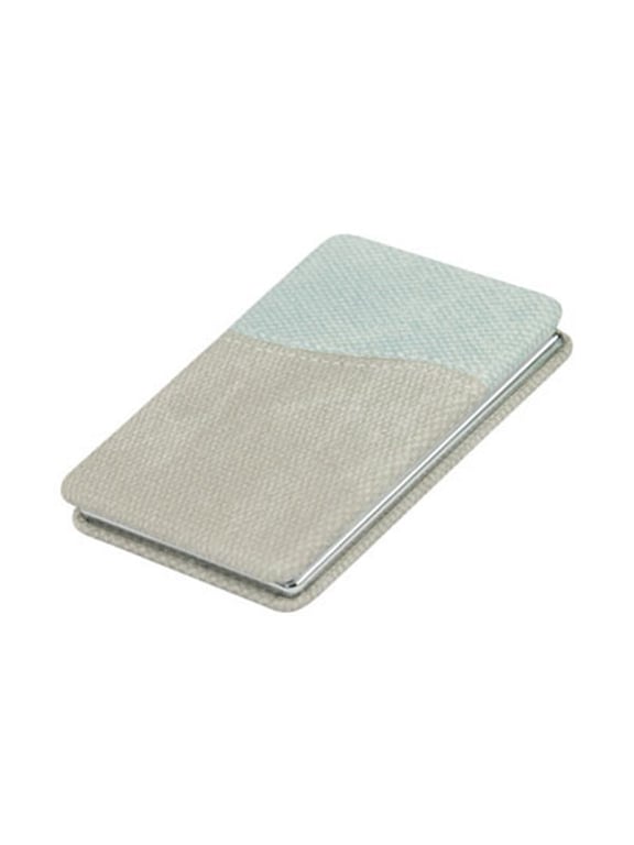 This exquisite pocket mirror boasts a captivating two-tone design. The upper portion showcases a delicate light blue, while the lower half is adorned with a sophisticated beige. Both sections feature a subtly textured fabric, adding a touch of refined elegance to its functionality. The sleek silver frame complements the colors perfectly, creating a cohesive and visually appealing aesthetic. This isn't just a functional item; it's a statement piece that reflects your sense of style.