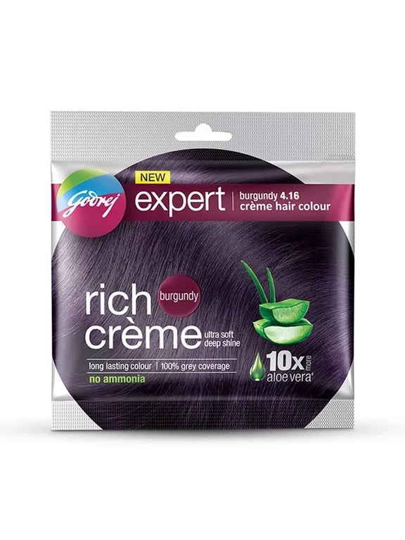 Transform your hair with Godrej Expert Rich Burgundy Crème Hair Color! This 20gm ammonia-free formula delivers a stunning burgundy shade with 10x more aloe vera for ultra-soft shine & 100% gray coverage.