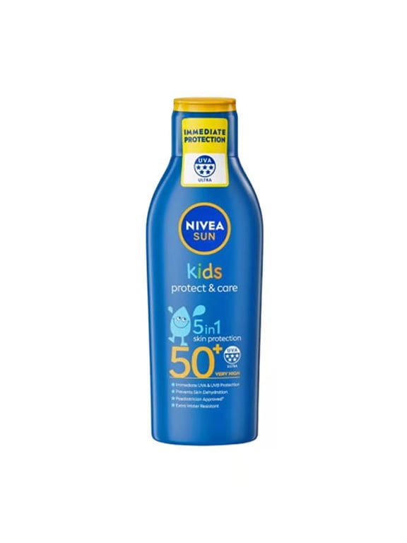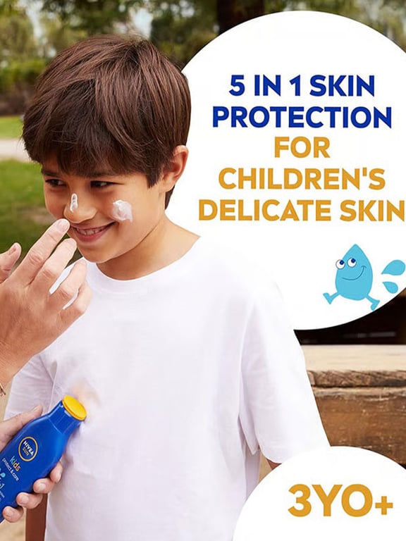 Shield your kids with Nivea Sun Kids Protect & Care! This pediatrician-approved 200ml bottle offers 5-in-1 protection: immediate UVA/UVB prevents dehydration and is extra water-resistant.