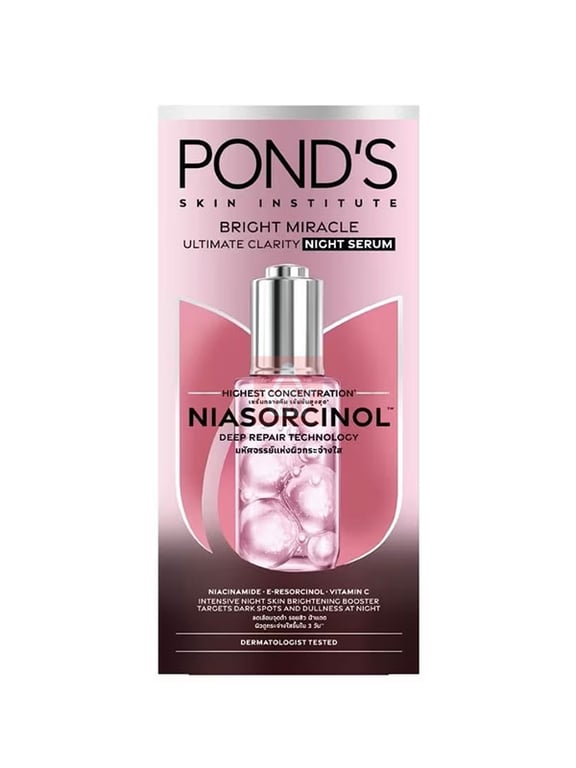Unleash your radiance with Pond's Bright Miracle Night Serum! This 30g serum, featuring Niasorcinol for deep repair, delivers intensive brightening.